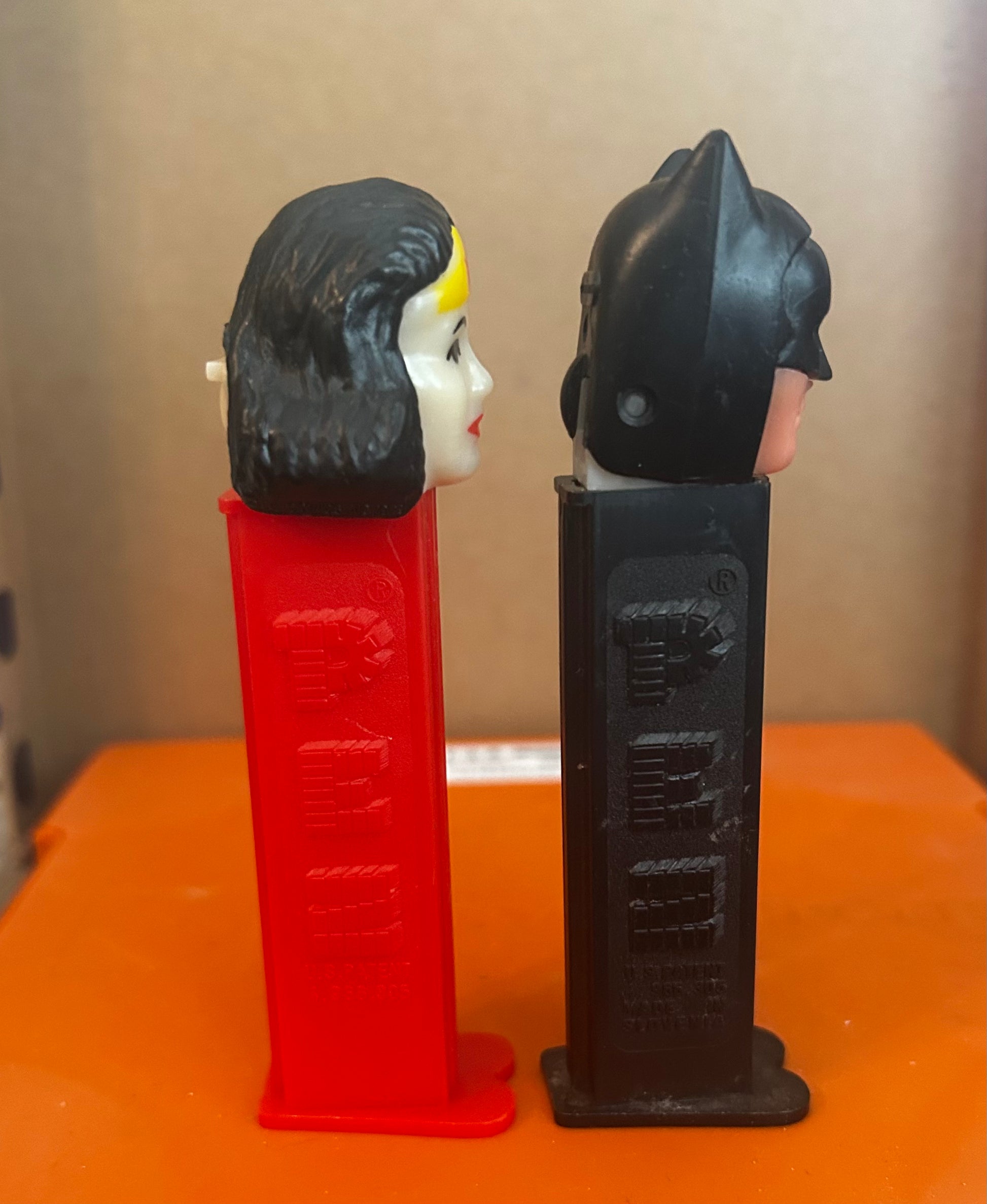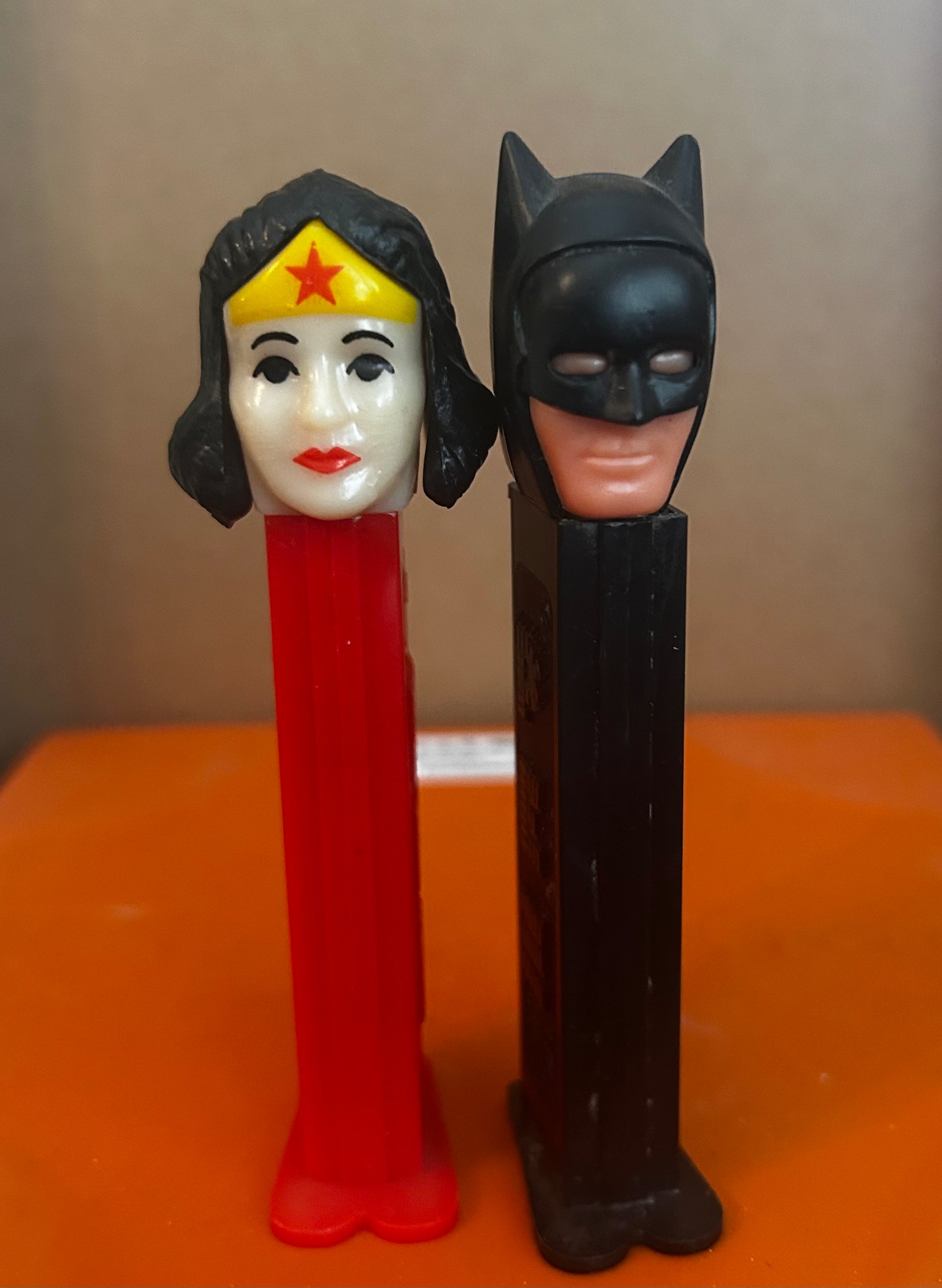 Vintage DC Super Heroes PEZ pair featuring Wonder Woman (red stem) and Batman (black stem).